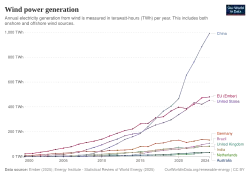 In 2024, wind supplied over 2,494 TWh of electricity, which was 8.1% of world electricity.[1] With about 100 GW added during 2021, mostly in China and the United States, global installed wind power capacity exceeded 800 GW.[2][3][4] 30 countries generated more than a tenth of their electricity from wind power in 2024 and wind generation has nearly tripled since 2015.[1] To help meet the Paris Agreement goals to limit climate change, analysts say it should expand much faster – by over 1% of electricity generation per year.[5]