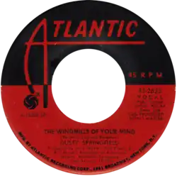 In April 1969, the third A-side release from Dusty in Memphis was announced as "I Don't Want to Hear It Anymore" with "The Windmills of Your Mind" as the B-side. However Wexler was prepared to promote "Windmills" as the A-side if it won the Oscar for Best Song, reportedly instructing mailroom clerks at Atlantic Records' New York City headquarters to listen to the Academy Awards broadcast the night of 14 April 1969. Hearing "The Windmills" announced as the Best Song winner was the clerks' cue to drive a station wagon loaded with 2500 copies of a double-sided promo single of Springfield's version – identified on the label as "Academy Award Winner" – to the New York City general post office, where the copies of the single were mailed out to key radio stations across the US.[6] Although its Hot 100 debut was not effected until the 5 May 1969 issue of Billboard and then with a No. 99 ranking, Springfield's "The Windmills" made a rapid ascent to the Top 40 being ranked at No. 40 on the Hot 100 of 24 May 1969 only to stall over the subsequent three weeks peaking at No. 31 on the Hot 100 of 14 June 1969 with only one additional week of Hot 100 tenure, being ranked at No. 45 on the 21 June 1969 chart. On the Cash Box chart, the song rose as high as No. 22.[7]
