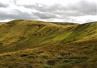 Windy Gyle is a mountain in the Cheviot Hills range, on the border between England and Scotland.[4] Like the other hills in the area, it is rounded and grass-covered.