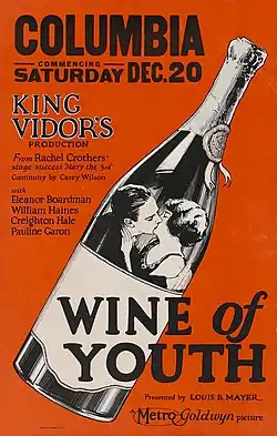 Wine of Youth is a 1924 American silent comedy drama film directed by King Vidor,[1] and released by Metro-Goldwyn-Mayer, shortly after the merger which created MGM in April 1924. Vidor did not consider it important enough to mention in his autobiography,[2] although it did advance the careers of three young stars-to-be: Ben Lyon, Eleanor Boardman, and William Haines.