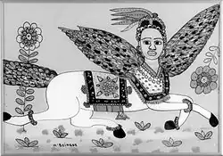 Lungta, or Wind Horse, in Tibetan Buddhism, is a flying horse, often winged, that was said to carry prayers from humans to the heavens.[11] The horse is known to have a large, colorful gem on its back and is depicted with the four other mythical creatures (dragon, garuda, snow lion, and tiger) on prayer flags.[12] As a symbol, the horse represents the buoyancy of life and fundamental goodness of the human spirit.[13]