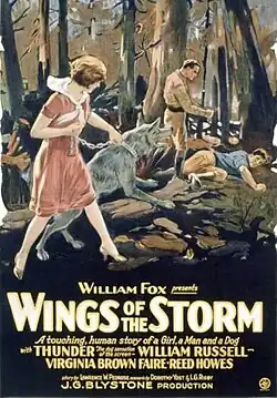 Wings of the Storm is a 1926 American "dog-hero" drama film directed by John G. Blystone and written by Elizabeth Pickett Chevalier, Gordon Rigby, and Dorothy Yost. Released in November 1926 by Fox Film Corporation, the film showcases Thunder the Marvel Dog with support from costars William Russell, Virginia Brown Faire, and Reed Howes.[1][2][3]