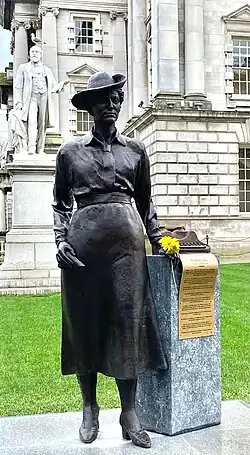 Following a 2012 Equality Impact Assessment that confirmed the grounds of Belfast City Hall were dominated by "white, male, upper class and unionist images,"[70][71] in 2017 Sinn Féin councilors proposed a monument to Carney.[72] A concession to unionist sensibilities that would have incorporated a representation of her husband was rejected (McBride appears with Carney in stained glass windows at the Duncairn Arts Centre in north Belfast).[70] Together with another bronze by the same artist, Ralph Sander, of the United Irishwoman and abolitionist Mary Ann McCracken, the figure of Carney was unveiled in front of the city hall on International Women's Day (8 March) 2024. Carney is depicted—typewriter on one side, Webley revolver on the other—in her 1916 Citizen Army uniform.[73]