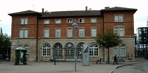 Winnenden station is a station in Winnenden in Baden-Württemberg, Germany. It lies on the Waiblingen–Schwäbisch Hall railway a few hundred metres northwest of the town centre and about one kilometre south of Leutenbach. The station is served by Regional-Express and Stuttgart S-Bahn trains. DB designates it as a class 3 station.