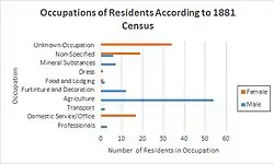 According to the 1881 census, the occupation sector that employed the most residents and the most males was agriculture. For the majority of the female residents, their occupation was unknown, or not specified. Those whose occupation was specified, they worked in the Domestic service and office sector.