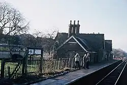 Winslow was regarded as an important station on the line, for it was the place where westbound trains for the Banbury Merton Street branch line or for Oxford were joined and divided in the early years, even after the opening of Verney Junction (where the lines actually divided).[15][16][17][18][19][20] Passenger facilities were provided on each platform which were more generous than those found elsewhere on the line.[19] Architecturally, the brick station resembled the stone structure provided at Bicester Town, particularly its twin symmetrical gables covered by ridge tiles and its portico.[21][22] A stationhouse was also provided for the stationmaster and this was situated just beyond the main station building and arranged around a circular driveway at the centre of which was a large horse chestnut tree.[21][23] A coal yard lay to the east of the station, while a goods yard was provided to the west.[24] Winslow Gasworks opened in 1880 on a site immediately to the south of the coal yard; it received up to 1000 tons of coal annually via the yard, although it was not rail-connected.[24][12] The station was lit by gas until the trains cease to call.[25]