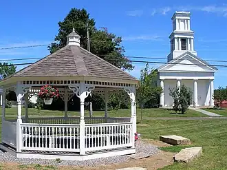 The historic district is bounded on the east by the Still River, and the north by Holabird Avenue, just north of the northern tip of the green. There are 77 historically significant buildings in the 28-acre (11 ha) district, not including the bandstand on the green, which was built in 1970. One of the most imposing houses is the 1844 Greek Revival house of lawyer Gideon Hall, Jr.; it features a two-story Doric Greek temple portico. The northern end of the green is visually anchored by the Romanesque First Congregational church, built in 1903.[2]
