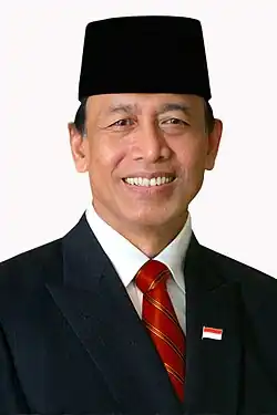 Wiranto (born 4 April 1947) is an Indonesian politician and retired army general, who is serving as the chairman of the Presidential Advisory Council, since December 2019. Previously, he was the Commander of the Indonesian Armed Forces from February 1998 to October 1999 during Indonesia's transition from authoritarian rule to democracy, he ran unsuccessfully for President of Indonesia in 2004 and for the vice-presidency in 2009. On 27 July 2016, Wiranto was appointed Coordinating Minister for Political, Legal, and Security Affairs, replacing Luhut Binsar Panjaitan.[1][2]