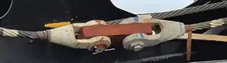 A wedge socket termination is useful when the fitting needs to be replaced frequently. For example, if the end of a wire rope is in a high-wear region, the rope may be periodically trimmed, requiring the termination hardware to be removed and reapplied. An example of this is on the ends of the drag ropes on a dragline. The end loop of the wire rope enters a tapered opening in the socket, wrapped around a separate component called the wedge. The arrangement is knocked in place, and load gradually eased onto the rope. As the load increases on the wire rope, the wedge become more secure, gripping the rope tighter.