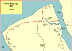 Writing in 1914, Mercer observed that the Wirral had become known as "'The Dormitory of Liverpool' owing to the number of people who reside on the Cheshire side of the Mersey and travel across under the water daily to and from business."[5][3] In addition, New Brighton had become a popular destination for trippers by steamer, but the railway transformed it into a residential town. The Wirral Railway extended from a triangular junction west of Birkenhead Docks to Wallasey, Grove Road. This too opened on 2 January 1888, and was completed as far as New Brighton on 30 March in the same year.[2]