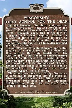 WSD is a residential school for deaf and hard of hearing students in the state of Wisconsin. It is operated under the direction of the Wisconsin Department of Public Instruction and provides educational services for deaf and hard of hearing students aged three to twenty-one. Phoenix Hall was listed on the National Register of Historic Places from March, 1987 to April 21, 2014.[1] The building was torn down several years prior to its removal from the National Register of Historic Places.[2]