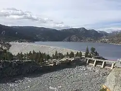 The earthen and rockfill gravity dam was constructed in 1958 by Pacific Gas and Electric Company (PG&E) with a height of 260 feet (79 m) and a length of 3,330 feet (1,010 m) at its crest.[4] Wishon Dam and its companion Courtright Dam, which stands about five miles to the north, along with other smaller auxiliary gravity dam structures, are elements of PG&E's Haas-Kings River Project.