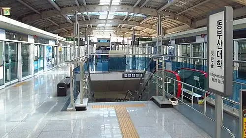 Witbansong Station (Korean: 윗반송역; Hanja: 윗盤松驛) is a station of the Busan Metro Line 4 in Bansong-dong, Haeundae District, Busan, South Korea. The station name Dong-Pusan College which came from the nearby Dong-Pusan College was renamed to Witbansong which means the upper Bansong-dong on 1 January 2021 because Dong-Pusan College closed down in September 2020.[1]