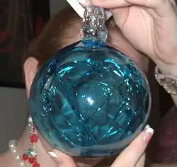 Witch balls sometimes measure as large as seven inches (18 cm) in diameter. The witch ball is traditionally, but not always, green or blue in colour and made from glass (others, however, are made of wood, grass, or twigs instead of glass). Some are decorated in swirls and brilliant stripes of various colours. Witch balls normally have a hole in the top where a peg can be inserted; string is then attached to the peg so the ball can be hung in a chimney or over a window. Early witch balls often had a short neck sealed by a stopper.[5] The gazing balls found in today's gardens are derived from the silvered witch balls that acted as convex mirrors, warding off evil by reflecting it away.