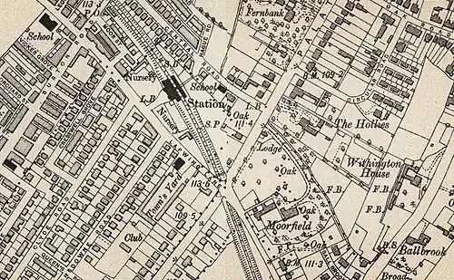 The line ran south through West Didsbury via a cutting, passing underneath Palatine Road. Withington & West Didsbury Station was situated on the north side of Lapwing Lane, set back from the road with a small forecourt area. The station building was a red brick Gothic Revival house, almost identical in style to other nearby stations of the period such as Didsbury. The building incorporated a booking hall, a parcels office, and ladies' and gentlemen's waiting rooms as well as a two-storey station master's house.[4] There were two platforms in the cutting with glass canopies and a footbridge.[2][3] Withington Town Hall, which stood opposite the station, was built for Withington Local Board in the early 1880s.[7]