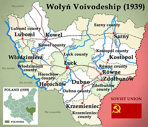 The Wołyń Voivodeship was created formally on 19 February 1921.[13] It was initially divided into the counties of Dubno, Horochow, Kowel, Krzemieniec, Luboml, Łuck, Ostróg, Równe and Włodzimierz Wołyński. On 1 January 1925 the gminas of Zdołbunów and Zdołbica of Równe county and gminas of Buderaż and Mizocz of Dubno one were passed to one of Ostróg. Center of Ostróg one was moved to Zdołbunów and was renamed as Zdołbunów one. Also gminas of Bereźne, Derażne, Kostopol, Ludwipol, Stepań and Stydyń were detached from county of Równe and one of Kostopol was formed. At same arrangements Majków gmina of Ostróg was passed to Równe one, Beresteczko gmina of Dubno one was passed to Horochow one, Ołyka gmina of Dubno one was passed to Łuck one, Radziwiłłów gmina of Krzemieniec was passed to Dubno one.[14]