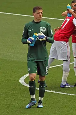 After starting his club career at Legia Warsaw, Szczęsny signed for Arsenal in January 2006, where he made his professional debut in 2009. After a spell on loan with Brentford the following season, he later became the capital club's first choice goalkeeper, winning two FA Cups and being the joint recipient of the 2013–14 Premier League Golden Glove alongside Petr Čech. He subsequently went on two consecutive season-long loans to Italian club Roma in 2015, where his performances earned him a move to reigning league champions Juventus in 2017. After serving mainly as a back-up to Gianluigi Buffon in his first season, during which he won a domestic double, he inherited the starting spot from the departed Buffon the following season, winning his second Serie A title; his performances also earned him a Yashin Trophy nomination in 2019.[4] He won a third consecutive league title the following season, also winning the Serie A Best Goalkeeper Award. He briefly retired from professional football in 2024, before reversing his decision shortly after to join Barcelona, where he won a domestic treble in his debut season.[5]