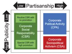 CSA is distinct from CPA—a firm's efforts (e.g. campaign contributions, lobbying, and donations to political action committees) to sway political processes and gain policy-related market advantages.[17][18] While both types of firm activities reflect involvement in the political process, they differ in the extent to which they are publicized. CSA is often utilized as a public demonstration of a firm's core values and principles. Conversely, CPA is an often-discreet activity that is typically made public only through "accidental disclosure".[19]