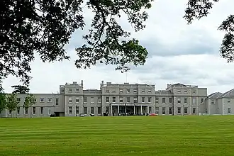 The building's two façades are the north-facing entrance front and the south-facing garden front.[1] The main building is focused around a three-storey central block with seven bays. This is connected on either side by three-bay, two-storey wings and abutted by two-wing, three-storey blocks. Upon the wings are balustraded parapets featuring urns on the two-storey sections.[7] Across the façade, the first storey is topped by a frieze and cornice, and the corners of the building feature plinths and rusticated quoins.[7] The entrance front features a porte-cochère with fluted columns and triglyph frieze.[7] In comparison, the garden front features a smaller projecting porch with Doric pilasters supporting a triangular pediment.[7]