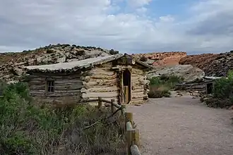 John Wesley Wolfe settled in the location in 1898 with his oldest son Fred.[2] A nagging leg injury from the Civil War prompted Wolfe to move west from Ohio, looking for a drier climate. He chose this tract of more than 100 acres (0.40 km2) along Salt Wash for its water and grassland - enough for a few cattle. The Wolfes built a one-room cabin, a corral, and a small dam across Salt Wash. For more than a decade they lived alone on the remote ranch. In 1906, John Wolfe's daughter Flora Stanley, her husband, and their children moved to the ranch.[3] Shocked at the primitive conditions, Stanley convinced her father to build a new cabin with a wood floor.