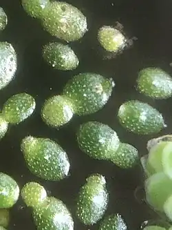 Wolffia brasiliensis is a species of flowering plant known by the common name Brazilian watermeal. It is native to North and South America, where it grows in mats on the surface of calm water bodies, such as ponds. It is a very small plant with no leaves, stems, or roots. The green part is up to 1.2 millimeters long with a flat surface with a bump in the center.