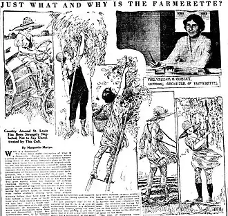 The Woman's Land Army of America (WLAA) operated from 1917 to 1919, organized in 42 states, and employing more than 20,000 women.[3][4] It was inspired by the women of Great Britain who had organized as the Women's Land Army, also known as the Land Girls or Land Lassies.[5] The women of the WLAA were known as 'farmerettes', a term derived from suffragettes and originally used pejoratively, but ultimately becoming positively associated with patriotism and women's war efforts. Many of the women of the WLAA were college educated, and units were associated with colleges.[6][7] Most of them had never worked on farms before.[4] The WLAA primarily consisted of college students, teachers, secretaries, and those with seasonal jobs or occupations which allowed summer vacation. They were paid equally with male farm laborers and had an eight-hour workday.[4] The WLAA workers eventually became wartime icons, much as Rosie the Riveter would in World War Two.[4]