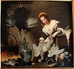 Despite the modern title the woman is in fact a general servant or maid rather than a cook – the precious silver plate shows the work to be set in a patrician palace kitchen, where at that date the cooks were always male.[3] The subject derives from the Flemish kitchen-set works of Pieter Aertsen and Joachim Beuckelaer, already known in Genoa at that time. Its genre subject would have placed it low in the art hierarchy of De Ferrari's time, but it is now considered one of Strozzi's best works, with much in common with contemporary Italian Baroque art[2] Some interpret it as an allegory of the five senses or the four elements, though this is not the majority view.[4]