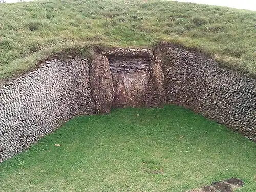 The term Womb Tomb (also, womb-tomb) is a form of Neolithic burial site. Europe's prehistory stretches for some 9500 years, from the earliest settlers after the last ice age to around AD 1000. Very little is known of the earliest human burials. The first grave structure of any type dates from circa 4000 BCE. Neolithic farmers had a strong tradition of building burial chambers covered by mounds. Unique burial sites suggest a reverence for birth and the female form. These are called Womb Tombs and are a subset of passage graves or passage tombs.[1] Recent studies show that many of the Neolithic passage graves in Scotland and Ireland were built using the symbolism of the female human womb.[2]