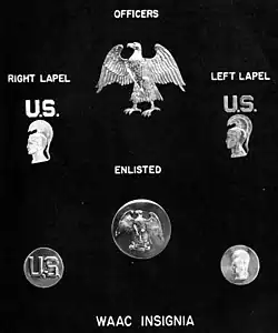 WAAC organizational insignia was a Rising Eagle (nicknamed the "Waddling Duck" or "Walking Buzzard" by WAACs). It was worn in gold metal as cap badges and uniform buttons. Enlisted and NCO personnel wore it as an embossed circular cap badge on their Hobby Hats, while officers wore a "free" version (open work without a backing) on their hats to distinguish them. Their auxiliary insignia was the dark blue letters "WAAC" on an Olive Drab rectangle worn on the upper sleeve (below the stripes for enlisted ranks). WAAC personnel were not allowed to wear the same rank insignia as Army personnel. They were usually authorized to do so by post or unit commanders to help in indicating their seniority within the WAAC, although they had no authority over Army personnel.
