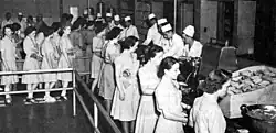 Black women served in the Army's WAAC and WAC, but very few served in the Navy.[46] African American women serving in the WAC experienced segregation in much the same fashion as in U.S. civilian life. Some billets accepted WACs of any race, while others did not.[47] Black women were taught the same specialties as white women, and the races were not segregated at specialty training schools. The US Army goal was to have 10 percent of the force be African-American, to reflect the larger U.S. population, but a shortage of recruits brought only 5.1 percent black women to the WAC.[48] The first African-American commissioned officer in the WAC was Charity Adams Earley.
