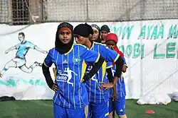 Football is the most popular women's sport in the country.[1] In schools, girls and boys do not play mixed football in Somalia.[1] On the adult level, there are 450 teams, 8 of which are available to women to play as mixed gendered teams and 6 which are women only.[1] In 2000, there were 280 registered female players on the junior and senior levels. This data was not kept from 2001 to 2004. In 2005, there were 1,435 registered female players but in 2006, the number dropped dramatically to 220.[1] This can be contrasted to futsal where there were 175 registered female footballers and 440 unregistered footballers in 2006.[1] In 2005, football was seen as a way to potentially help rebuild the country, with the concept having support from Somali women living abroad.[13] Women from Djibouti have been working to help Somali play football. Muslim extremists inside the country have made it difficult for women to play because of restrictions on what women can do. Inside Somalia, women have been completely prohibited from playing any sport.[14] Rights to broadcast the 2011 Women's World Cup in the country were bought by Al Jazeera,[15] despite the government having banned people from watching the men's competition in 2006 which resulted in several deaths.[16][17]