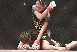 While mixed martial arts is primarily a male dominated sport, it does have female athletes.[1][2][3] For instance, Female competition in Japan includes promotions such as DEEP Jewels. Now defunct promotions that featured female fighters were Valkyrie, and Smackgirl.[4] Professional mixed martial arts organizations in the United States that invite women to compete are industry leader Ultimate Fighting Championship, the all female Invicta Fighting Championships, Resurrection Fighting Alliance, Bellator Fighting Championships, and Legacy Fighting Championship. Now defunct promotions that featured female fighters were Strikeforce and EliteXC.[5] There has been a growing awareness of women in mixed martial arts due to popular female fighters and personalities such as Amanda Nunes, Megumi Fujii, Gina Carano, Ronda Rousey, Miesha Tate, Holly Holm, Alexa Grasso, and Joanna Jędrzejczyk and among others.[6] Carano became known as "the face of women's MMA" after appearing in a number of EliteXC events.[7][8][9] This was furthered by her appearances on MGM Television's 2008 revival of their game show American Gladiators.[10][11][12][13]
