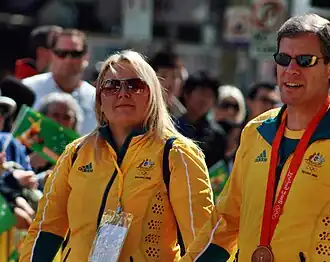 ![]() Melbourne homecoming parade for 2008 Olympic Team. Shooters, Stacy Roiall, women's trap, and bronze medalist Warren Potent, 50m Prone Rifle. | |