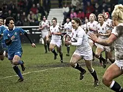 ![]() England's Lauren Cattell runs with the ball as Italy's Manuela Furlan chases, in a scene from a Women's Six Nations match | |