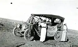 Martin and Mabel Vernon traveled more than 3,000 miles around the state, driving on unimproved roads campaigning.[27][23] Martin rented a Ford Model T, which she sometimes used as her speaking platform.[23] The car was able to travel an average of 15 miles a day on the dusty roads and the women sometimes slept in the car.[23] Other times, they took very long trips, making 100 miles in one day to reach seventy voters.[33] The suffragists called their work "prospecting for votes" and did, in fact, go down into mines by "tunnel, ladder or in buckets lowered by a windlass" to talk to voters where they worked.[34] Vernon used the experience of the grueling trip she and Martin took to reach voters.[35] People in Nevada had made similar journeys themselves and respected the "courage" of the suffragists to do the same.[35]