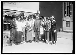 Belle Case La Follette and her daughter, Fola, became involved in the campaign.[56] During the campaign, La Follette spoke on women's suffrage throughout the state, seven days a week, several times day.[57] La Follette influenced first both PEL and WWSA to organize on the grassroots level.[58] They contacted women of influence to host suffrage meetings in their hometowns and the state suffrage groups provided speakers.[58] Suffragists also spoke to labor unions and promised that low wages would end when women could vote.[59] The grassroots approach also helped suffragists reach out to working class women, and women who stayed at home.[60]