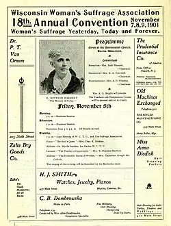 Another state convention was held in Milwaukee in 1869 on February 24–25.[20] Anneke had called for a convention to be held in the city and it was arranged by Lila Peckham and Laura Ross Wolcott and included speakers Susan B. Anthony, Mary Livermore, and Elizabeth Cady Stanton.[20][22] The convention helped re-energize the suffrage movement in Wisconsin.[22] At the convention, the Wisconsin Woman Suffrage Association (WWSA) was formed.[22]