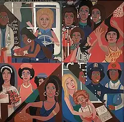 In 1972, as part of a commission sponsored by the Creative Artists Public Service Program, Ringgold installed For the Women's House[19] in the Women's Facility on Rikers Island. The large-scale mural is an anti-carceral work, composed of depictions of women in professional and civil servant roles, representing positive alternatives to incarceration. The women portrayed are inspired by extensive interviews Ringgold conducted with women inmates, and the design divides the portraits into triangular sections—referencing Kuba textiles of the Democratic Republic of the Congo. It was her first public commission and widely regarded as her first feminist work.[20] Subsequently, the work inspired the creation of Art Without Walls, an organization that brings art to prisons.[6]