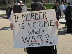 Women in Black (Hebrew: נשים בשחור, romanized: Nashim BeShahor) is a women's anti-war movement with an estimated 10,000 activists around the world. The first group was formed by Israeli women in Jerusalem in 1988, following the outbreak of the First Intifada.[1]