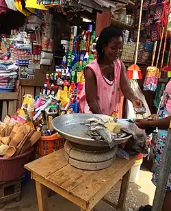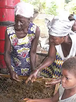 Today, women make up 43.1% of economically active population in Ghana, the majority working in the informal sector and in food crop farming.[18] In crop farming, women the majority of women work in weeding, planting, and selling food crops.[24] About 91% of women in the informal sector experience gender segregation and typically work for low wages.[18] Within the informal sector, women usually work in personal services. There are distinct differences in artisan apprenticeships offered to women and men, as well. Men are offered a much wider range of apprenticeships such as carpenters, masons, blacksmiths, mechanics, painters, repairers of electrical and electronic appliances, upholsters, metal workers, car sprayers, etc. In contrast, most female artisans are only involved in either hairdressing or dressmaking.[18] Women generally experience a disparity in earnings, receiving a daily average of 6,280 cedis compared to 8,560 cedis received by men according to the Ghana Living Standards Survey.[18]