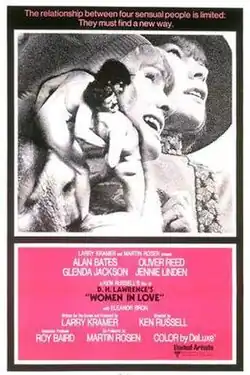 Women in Love is a 1969 British romantic drama film directed by Ken Russell and starring Alan Bates, Oliver Reed, Glenda Jackson, and Jennie Linden.[2] The film was adapted by Larry Kramer from D. H. Lawrence's 1920 novel Women in Love.[3] It was the first film to be released by Brandywine Productions.[4]