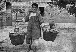 Pre-modern Chinese society was predominantly patriarchal and patrilineal from the 11th century B.C. onward.[15] The freedoms and opportunities available to women varied depending on the time period and regional situation. Women's status, like men's, was closely tied to the Chinese kinship system.[16] From the ancient Chinese views, the family structure is the micro-system of the political system. Therefore, loyalty towards the Emperor is the same as the women inside the family who should obey their husbands to fulfilled the rule that had been set up for a long tradition.[17] A prejudiced preference for sons has long existed in China, leading to high rates of female infanticide. There was also a strong tradition of restricting women's freedom of movement, particularly that of upper-class women, which manifested through the practice of foot binding. However, the legal and social status of women has greatly changed in the 20th century, especially in the 1970s, after the one-child and opening-up policies were enacted.[18]