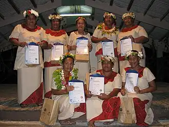 Tuvaluan women have access to secondary education at Motufoua Secondary School on Vaitupu[6] and Fetuvalu Secondary School, a day school operated by the Church of Tuvalu, on Funafuti.[7] Three tertiary institutions offer technical and vocational courses for women: Tuvalu Atoll Science Technology Training Institute (TASTII), Australian Pacific Training Coalition (APTC) and University of the South Pacific (USP) Extension Centre.[8] There are opportunities of further education and paid employment with non-government organisations (NGOs) and government enterprises, education and health agencies being the primary opportunities for Tuvaluan women.