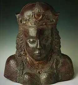 The feminine Zoroastrian divinities are neither passive nor defined by traditional female social roles.[7] Something akin to such a role only applies to one of the divinities, Spenta Armaiti, who is represented as a pious and obedient daughter of Ahura Mazda, a "mother of all" and a "queen of paradise" who purifies the wombs of women after birth and is therefore critical to the continued existence of humanity.[7] The Amesha Spenta associated with water, Haurvatat, is often described with epithets such as sūrā ("strong") and anāhitā ("undefiled") and is credited with bestowing fertility on both women and men, and increasing fields, crops, herds, and possessions.[7] As Anahita, Haurvatat has historically also been venerated as a warrior who brought victory to Iran and its soldiers. She was likened to a "Persian Artemis" in Parthian (247 BCE–224 CE) times[7] and her cult gained special recognition in the Sasanian period (224–651).[9] Sasanian kings were crowned in Anahita's temple in Istakhr[9] and the heads of defeated enemies were reportedly sent to this temple.[7]