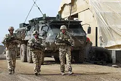 In spite of this, women in ground combat positions are typically only deployed to guard duties in relatively quiet areas. Women are excluded from frontline infantry brigades which are actively deployed into combat zones.[39] Female infantry combatants are limited to three mixed-gender infantry battalions (the Caracal, Lions of the Jordan, and Bardelas battalions) which are deployed along Israel's border with Egypt, the Jordan Valley, and the Arava region to guard against infiltration and smuggling attempts, the IDF's Oketz K9 unit, the Combat Intelligence Collection Corps, and the Search and Rescue Unit of the Home Front Command. Although they are expected to respond if a combat situation breaks out during operational activity, female infantry soldiers are not actively deployed into war zones. They are also subjected to lighter physical training standards than male soldiers.[40] Female tank crews are limited to the Border Defense Array, in tanks guarding the borders with Egypt and Jordan, and are not part of regular armored units that are deployed into war zones. Their sole expectation as combatants is to return fire from a stationary position if engaged.[41][42][43]