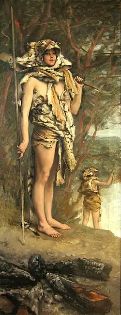 The Upper Paleolithic era is known for displaying a wealth of artistic representations of women, which are generally grouped together under the term of Venus figurines as some of the first works of human culture in history. Venus figurines are noted for their exaggerated sexual characteristics, commonly taken as symbols of fertility and sexuality, and include the earliest known representation of a human being; Known as the Venus of Hohle Fels, it is described by anthropologist Nicholas Conard as "about sex, reproduction... [it is] an extremely powerful depiction of the essence of being female".[12] Other notable figurines include the Willendorf, Dolní Věstonice, and Moravany Venuses, all of which are distinguished by a focus on the hips, breasts, and stomach.[13] Examples are generally centered around Europe, inhabited at the time by relatively advanced Cro-Magnon cultures, though the term has been applied as far abroad as Siberia.[14] Similar motifs from subsequent eras include the Potnia Theron, found in the ancient Mediterranean and Near East.[15][16]