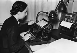 During the Second World War, temporarily contradicting their past claims, the Nazis changed policy and allowed women to join the German army. Adolf Hitler had already affirmed in a speech to activists of the National Socialist Women's League on September 13, 1936: "We possess a generation of healthy men – and we, National Socialists, are going to watch – Germany will not form any section of women grenade throwers or any corps of women elite snipers."[56] Therefore, women were not assigned to combat units during the war, but were regarded as auxiliary military personnel, responsible for logistical and administrative duties in the areas understaffed due to the number of men sent into combat. Other women also worked in factories or in military education. Military members of the Reichsbahn (National Company of Railways) or the Feuerwehr (firefighters) wore uniforms appropriate to the era, especially with a skirt. Gertrud Scholtz-Klink, NSDAP member and leader of the National Socialist Women's League stated: