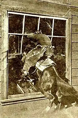 Tony is most known for his intelligence and ability to perform remarkable stunts, many of which would not be allowed today due to the danger involved. Tony performed in the years before the American Humane Association oversaw the use of animals on American productions. Since animals cannot verbalize agreement to be actors, the American Humane Association began to oversee how animal labor was created, filmed, and commercialized in 1940, eight years after Tony's retirement.[12] Tony was a naturally gaited Tennessee Pacer or Walking horse. He received his initial breaking and gait training from Kentucky trainer Tom Brinley. A later owner, Pat Chrisman, further trained him for tricks and stunts, then sold him to Tom Mix. Mix reportedly did not have to train Tony, but simply show him what to do for each feat. Mix could convey any sort of message to the pony by touches of the hand or fingers on Tony's neck, although speculation existed that whips, strong bits, and spurs were used. Such stunts included untying Mix’s hands, opening gates, jumping over high fences, getting tangled in ropes, loosening his reins, rescuing Mix from fire, jumping from one cliff to another, and running after trains.[13][14] In the 1926 film The Great K & A Train Robbery (Fox Film Corporation), Mix jumps Tony through a glass window into a building and rides him alongside a speeding train. In the film Trailin' (1921) Mix and Tony have a bridge slashed from under them, and uncut footage shows the pair tipping over to the river below.[15]