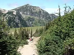 The traditional route between Mowich Lake and the Carbon River is via Ipsut Pass and Ipsut Creek. Many people take an alternative route across Spray Park and Seattle Park, a higher elevation route that often lies under snow until late August.[5]