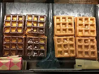 Among the early supporters of the food item were Jezebel,[6] which DNAinfo.com author Serena Dai credits with causing the wonut to go viral.[4] The creation, which was promptly featured on The Chew, is credited to Waffles Cafe owner Alex Hernandez,[7] a product of Le Cordon Bleu and former manager of Japonais in New York.[8] By May 2014, DK's Donuts made a product that they called wownuts, available to the Los Angeles area.[9][10] The original Waffles Cafe location, which had been opened in 2012, was closed at the beginning of 2016 for renovation and was later that year shut down after losing its business license when it failed to pay a $15,000 debt.[11]